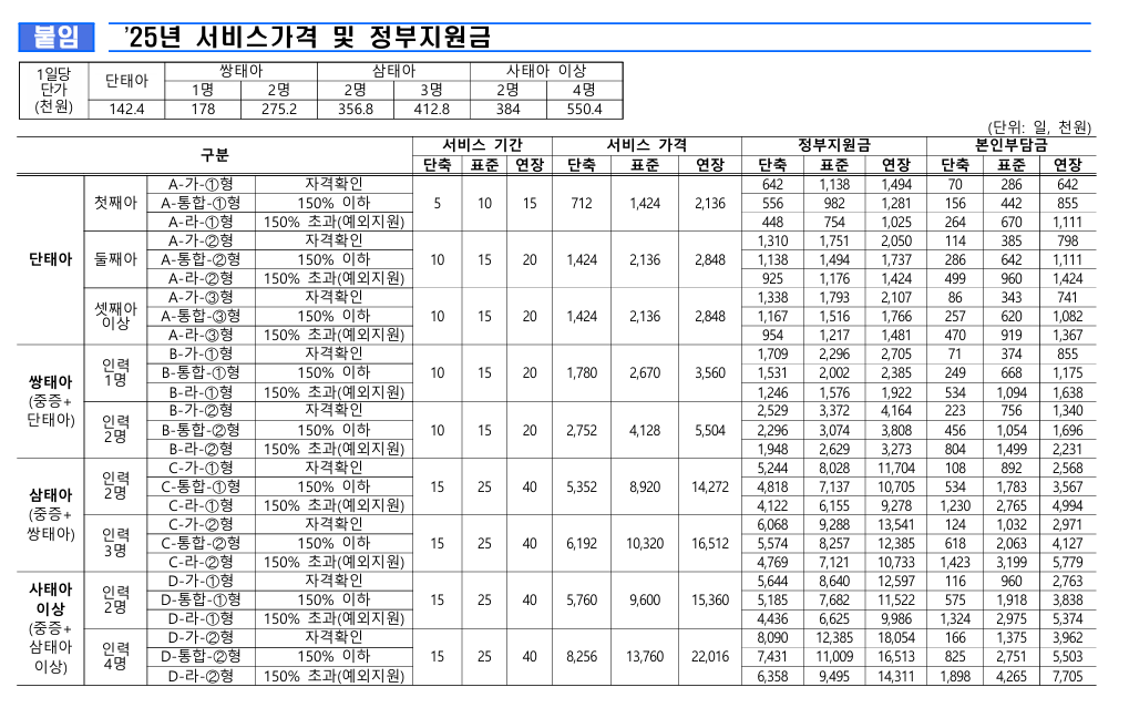 25년 산모 · 신생아 건강관리 지원사업 서비스가격 및 정부지원금